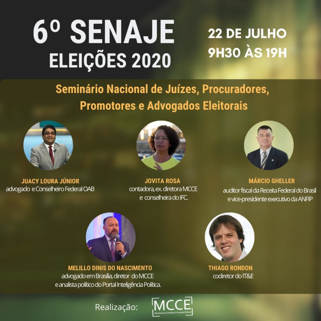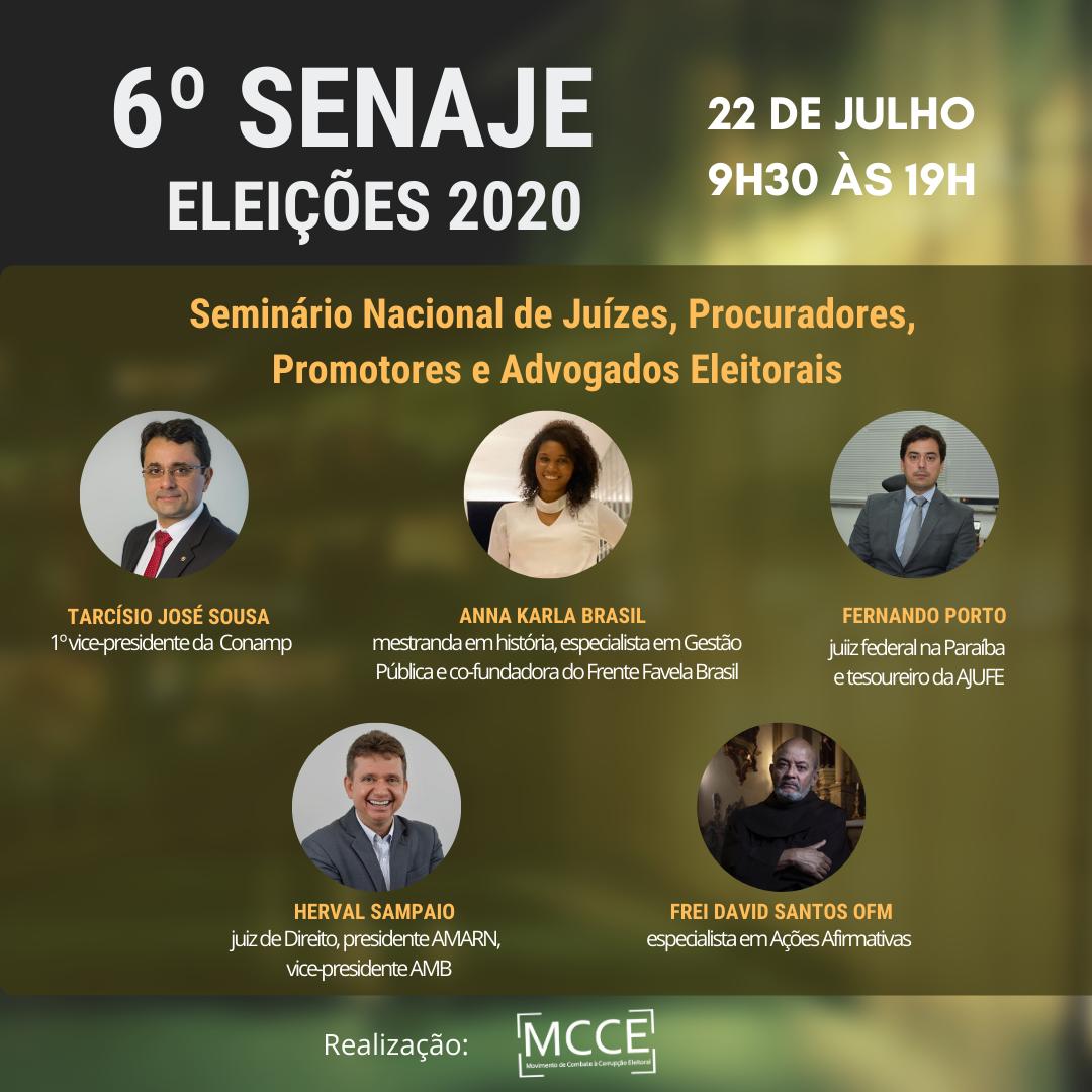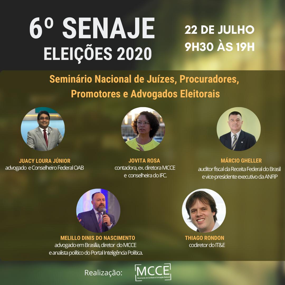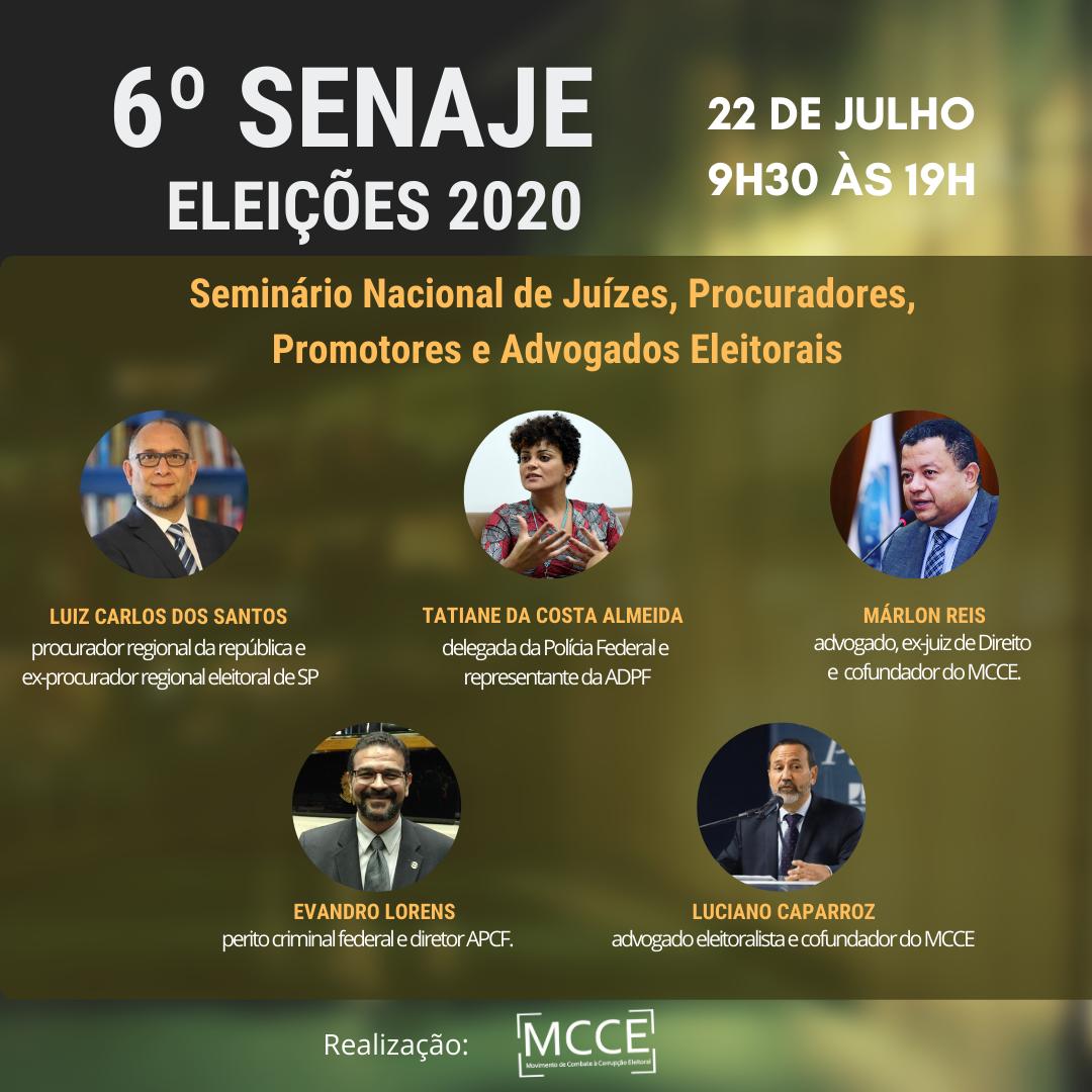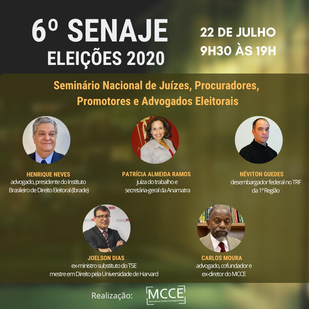 O Movimento de Combate à Corrupção Eleitoral (MCCE) irá realizar no dia 22 de julho, em formato virtual, a 6ª edição do Senaje – Seminário Nacional de Juízes, Procuradores, Promotores e Advogados Eleitorais.