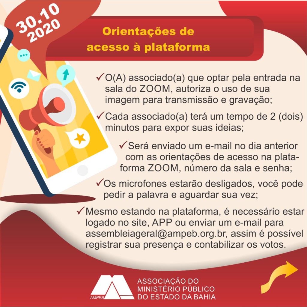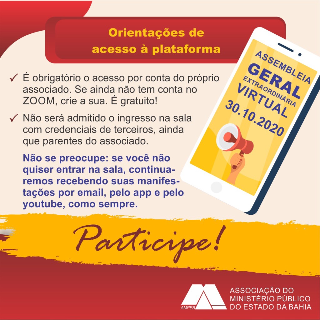 – Mesmo estando na plataforma, é necessário estar logado no site, APP ou enviar um e-mail para assembleiageral@ampeb.org.br , assim é possível registrar sua presença e contabilizar os votos.