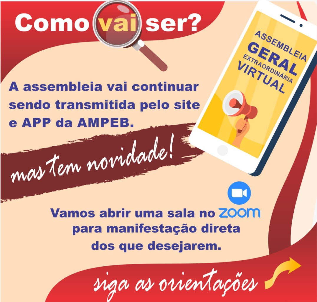 Nesta edição, a Ampeb vai abrir uma sala no Zoom para manifestação direta dos que desejarem. Para a participação pelo Zoom, será enviado um e-mail no dia anterior com as orientações de acesso à plataforma, com número da sala e senha.