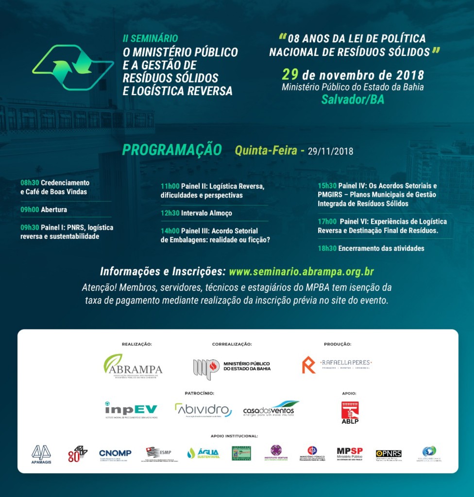 A Associação Brasileira dos Membros do Ministério Público de Meio Ambiente – Abrampa realizará o II Seminário – O Ministério Público e a Gestão de Resíduos Sólidos e Logística Reversa, no dia 29 de novembro de 2018, em Salvador. O evento conta com o apoio do Ministério Público do Estado da Bahia, da Associação do Ministério Público do Estado da Bahia – Ampeb, e outras instituições.