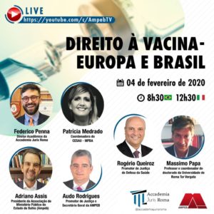 Na próxima semana, dia 04/02, a Ampeb e a Accademia Juris Roma vão realizar palestra sobre “Direito a vacina – Europa e Brasil”, no dia 04/02, a partir das 8h30, horário local. O evento marca o início da parceria entre as instituições, que concede descontos especiais aos associados nos cursos ofertados.