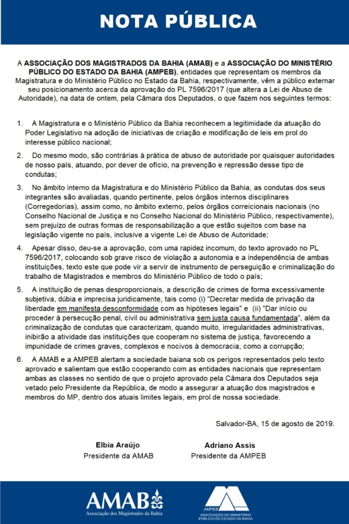 A ASSOCIAÇÃO DOS MAGISTRADOS DA BAHIA (AMAB) e a ASSOCIAÇÃO DO MINISTÉRIO PÚBLICO DO ESTADO DA BAHIA (AMPEB), entidades que representam os membros da Magistratura e do Ministério Público no Estado da Bahia, respectivamente, vêm a público externar seu posicionamento acerca da aprovação do PL 7596/2017 (que altera a Lei de Abuso de Autoridade), na data de ontem, pela Câmara dos Deputados, o que fazem nos seguintes termos: