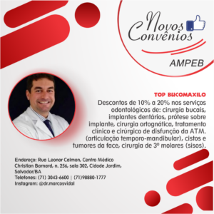 Pensando em aumentar a gama de conveniados, a Ampeb firmou uma parceria com a TOP BUCOMAXILO com descontos de 10% a 20% nos serviços odontológicos de: cirurgia bucal, implante dentário, prótese sobre implante, cirurgia ortognática, tratamento clínico e cirúrgico de disfunção da ATM. (articulação temporo-mandibular), cistos e tumores da face, cirurgia de 3º molares (sisos).