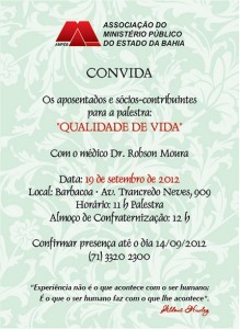 A Ampeb realizará nesta quarta-feira, 19, uma palestra destinada especialmente aos aposentados e sócios-contribuintes da associação. A apresentação terá como tema “Qualidade de Vida” e será ministrada pelo médico Robson Moura, a partir das 11h, no Restaurante Barbacoa, localizado na Avenida Tancredo Neves. Após a palestra haverá ainda um almoço de confraternização com os presentes.
