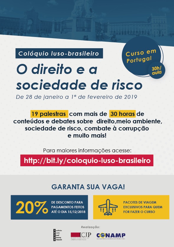 O curso, de 30h/aula, está sendo promovido pela CONAMP e afiliadas. A iniciativa está sendo desenvolvida em parceria com a Universidade de Lisboa, com a qual a CONAMP já desfruta de convênios com o Instituto de Direito Penal e Ciências Criminais (IDPCC) e o Instituto de Ciências Jurídico-Políticas (ICJP), ambos da Faculdade de Direito da Universidade.
