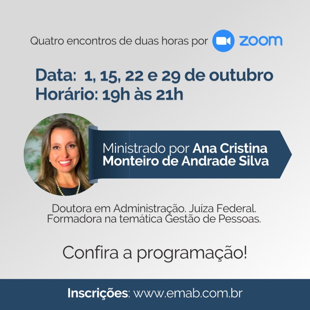 Nos dias 1º, 8, 15 e 22 de outubro, das 19h às 21h, será promovido o treinamento de Gestão com Empatia com Ana Cristina Monteiro de Andrade Silva, doutora em Administração da temática Gestão de Pessoas. A Ampeb irá sortear 10 inscrições entre os associados inscritos por meio da enquete, disponível no site e aplicativo.
