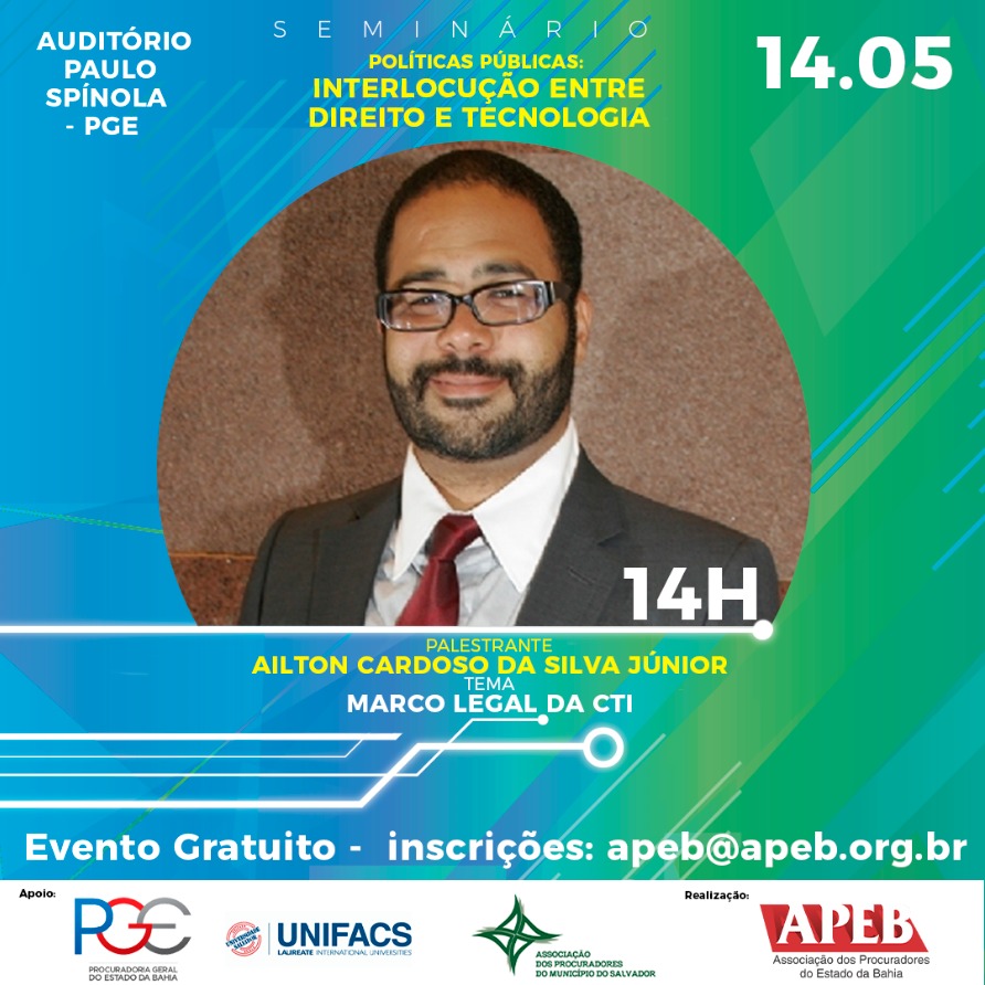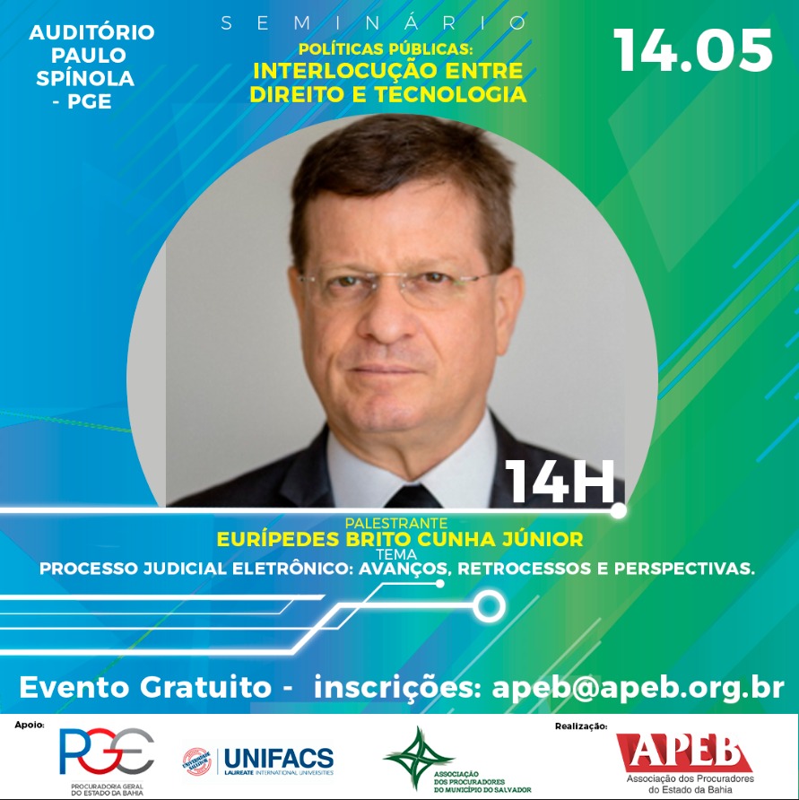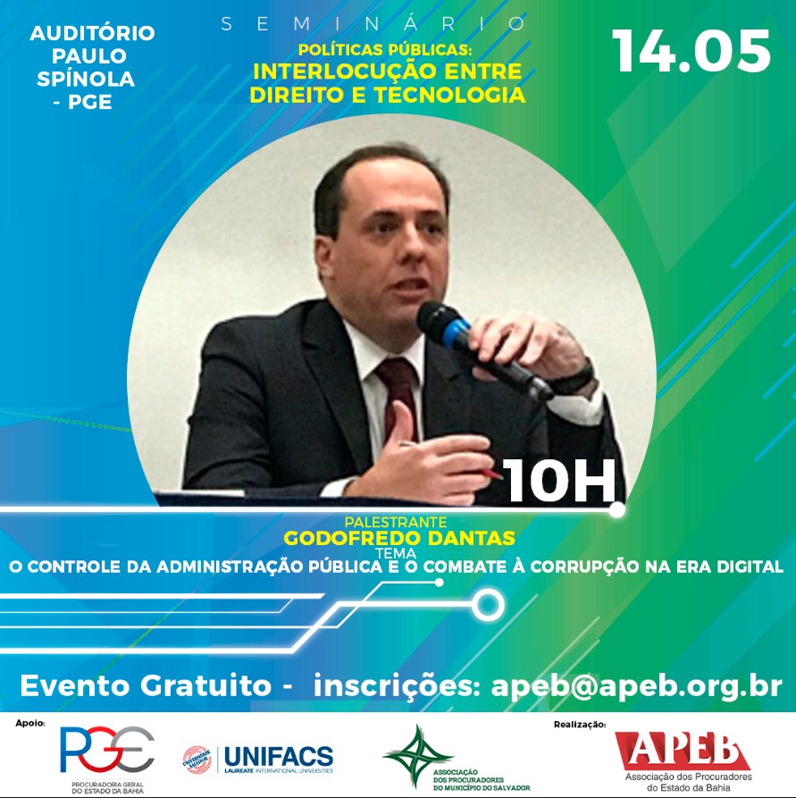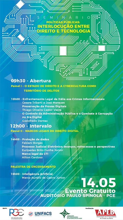 A Associação dos Procuradores do Estado da Bahia (APEB) vai promover amanhã, dia 14 de maio, o seminário “Políticas Públicas: Interlocução entre Direito e Tecnologia”, no auditório Paulo Spínola, na Procuradoria Geral do Estado (PGE).