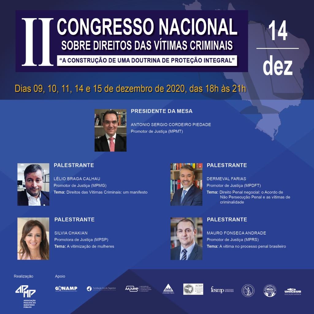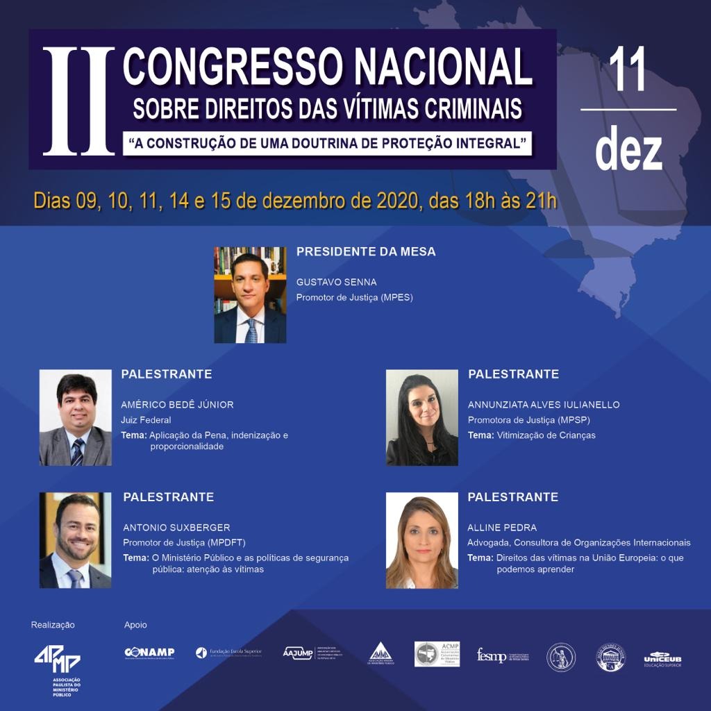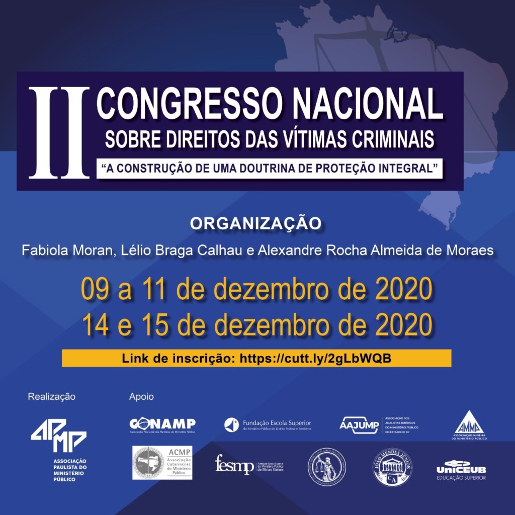 O II Congresso Nacional de Direitos das Vítimas Criminais: “A Construção de uma Doutrina de Proteção Integral”, ocorrerá nos dias 09, 10, 11, 14 e 15 de dezembro, sempre às 18h00. O evento online, com realização da APMP, conta com o apoio da Associação Nacional dos Membros do Ministério Público (CONAMP) e será transmitido pelo canal do Youtube da APMP. A idealização e organização do Congresso são dos Promotores de Justiça Fabiola Moran (MPSP), Lelio Braga Calhau (MPMG) e Alexandre Rocha Almeida de Moraes (MPSP).