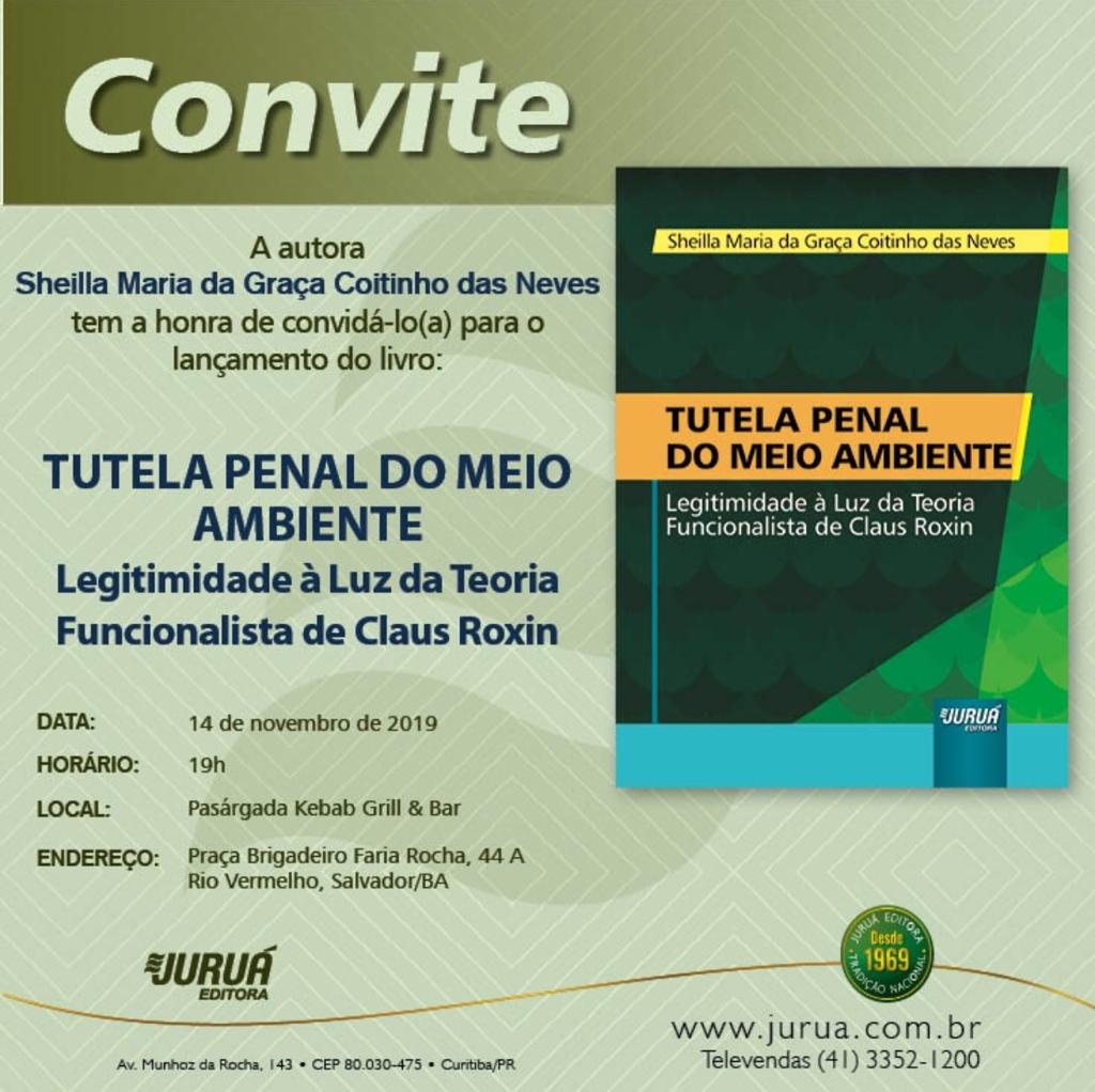 A procuradora de Justiça do MP-BA e associada da Ampeb, Sheilla Coitinho, vai realizar o coquetel de lançamento do livro de sua autoria “Tutela Penal do Meio Ambiente – Legitimidade à Luz da Teoria Funcionalista de Claus Roxin”, na próxima quinta-feira (14/11), às 19h, no Pasárgada kebab Grill & Bar, no Rio Vermelho.