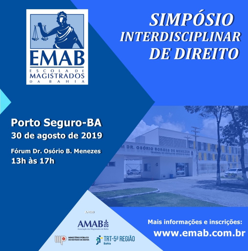 O Simpósio, que conta com apoio do da Associação dos Magistrados da Bahia (AMAB), Tribunal Regional do Trabalho da 5ª Região (TRT5) e Ministério Público do Estado da Bahia (MPBA), acontecerá a partir das 13h, no Fórum Dr. Osório Borges de Menezes, e será voltado a magistrados, operadores do Direito e estudantes.