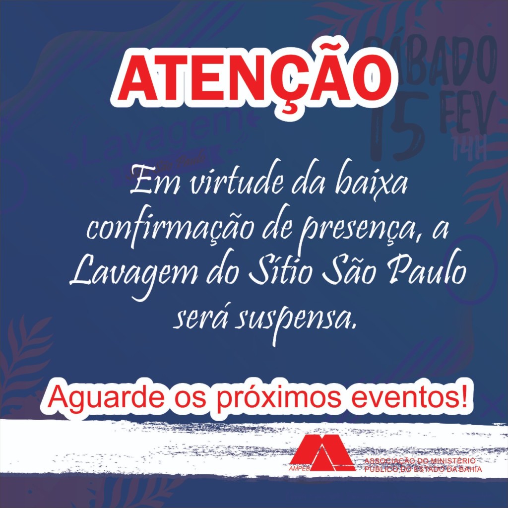 A Ampeb informa que a primeira Lavagem do Sítio São Paulo, que seria realizada no dia 15/02/2020, foi cancelada por conta da baixa adesão ao evento.