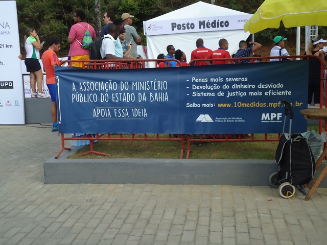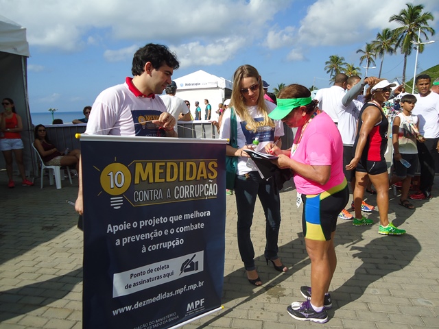 Na manhã deste domingo, 4, a Ampeb, em conjunto com o Ministério Público Federal (MPF) na Bahia, esteve presente na corrida Farol a Farol, no ponto de partida e de chegada de Ondina, em frente ao Clube Espanhol, com o objetivo de coletar assinaturas em apoio à campanha “10 medidas contra a corrupção”. Na ocasião, foram coletadas, em média, 560 assinaturas.