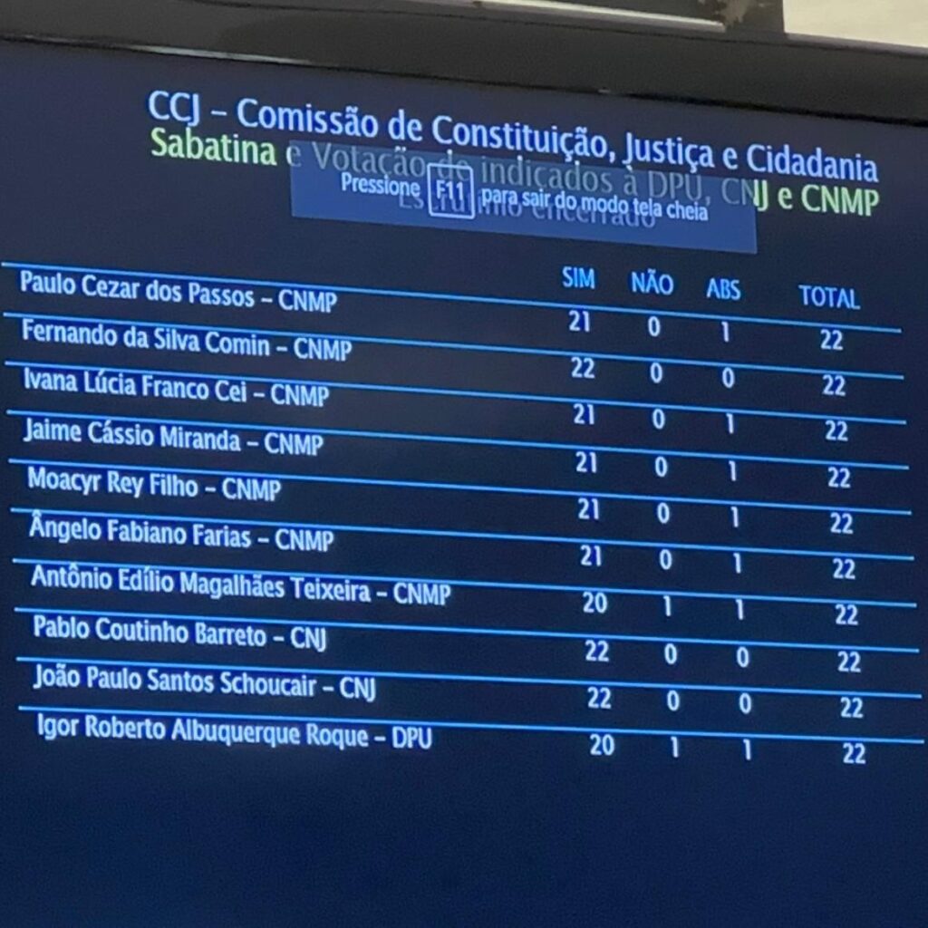 Para o CNMP, a CCJ aprovou a recondução de Ângelo Fabiano Farias, Antônio Edílio Teixeira, Jaime Cássio Miranda, Moacyr Rey Filho e Paulo Cezar dos Passos. Já Fernando da Silva Comin e Ivana Lúcia Cei conquistaram os votos para as outras duas vagas do órgão colegiado. Os nomes também serão submetidos à análise do Plenário.