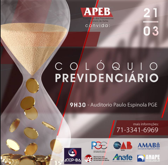 A Associação do Procuradores do Estado da Bahia – APEB, vai promover na próxima quinta-feira, dia 21/03, o “Colóquio Previdenciário: o que pode mudar?”, no Auditório Paulo Espínola (PGE), no CAB, a partir das 09h30.