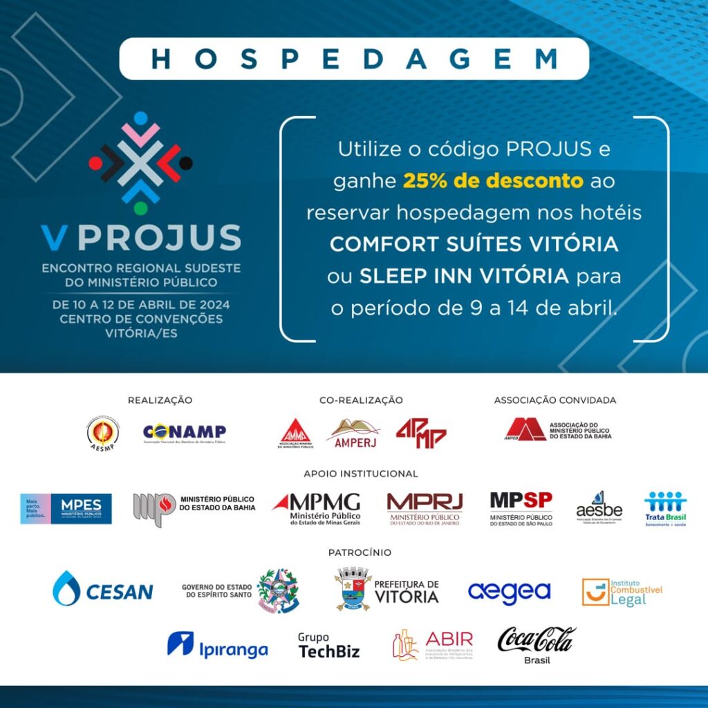 A AMPEB foi convidada pela Associação Espírito-Santense do Ministério Público (AESMP) para participar do V Congresso PROJUS, encontro regional sudeste do MP que acontecerá, de 10 a 12 de abril, em Vitória (ES). A entidade baiana também pagará as inscrições dos dez primeiros associados que manifestarem interesse pelo ampeb@ampeb.org.br .