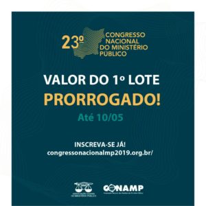 Atendendo a pedidos de diversas Associações e colegas, a CONAMP e a AGMP deliberaram por prorrogar para o dia 10/05 o prazo de inscrições com valor promocional do 1º lote para o 23º Congresso Nacional do Ministério Público. Assim, o valor das inscrições continuará a ser de R$650,00, com gratuidade para um acompanhante. Após o dia 10, o valor da inscrição passa para R$ 700,00 e a do acompanhante para R$ 250,00. Para fazer a inscrição, acesse o site oficial do evento aqui.