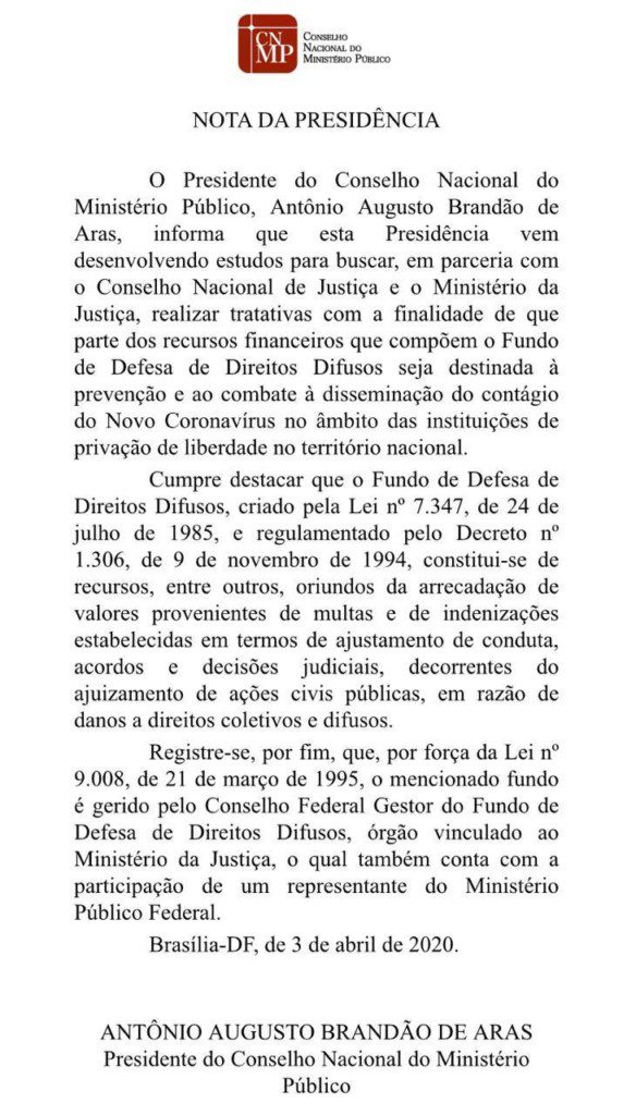 O procuradora-geral da República e presidente do Conselho Nacional do Ministério Público (CNMP), Antônio Augusto Brandão de Aras, publicou, nesta sexta-feira (03/04), nota a respeito dos estudos que vêm sendo feitos no sentido de destinar parte dos recursos financeiros do Fundo de Defesa de Direitos Difusos para a prevenção e combate ao Coronavírus.