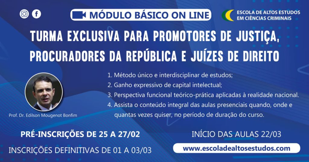 A Escola de Altos Estudos em Ciências Criminais vai promover, a partir de 22 de março, turma online, exclusiva para promotores de Justiça, procuradores da República, juízes de direito e juízes federais. As vagas são limitadas! As pré-inscrições vão até este sábado, dia 27 de fevereiro.