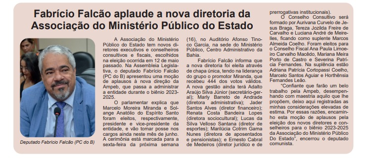 O deputado estadual Fabrício Falcão (PCdoB) apresentou, na Assembleia Legislativa da Bahia (AL-BA), uma moção de aplausos à nova direção da AMPEB, que tomará posse nesta sexta-feira (16).