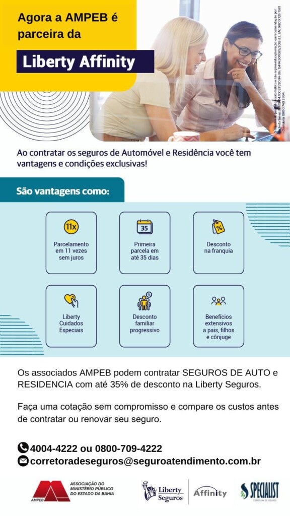 Os nossos associados poderão ter até 35% de desconto na contratação de seguros de automóveis e residenciais na Liberty Seguros, por meio da corretora Specialist. Quem se interessar pode obter mais informações através dos telefones 4004-4222 | 0800 709-4222 ou do e-mail: corretoradeseguros@seguroatendimento.com.br .