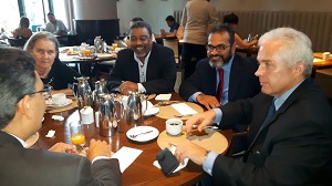 O diretor administrativo da Ampeb, Edmundo Reis, participou de café da manhã no Hotel Sheraton da Bahia, nesta quarta-feira (13/01) com Thomas Lloyd, Ministro Conselheiro para Assuntos Consulares na Embaixada Americana no Brasil para trocar experiências vivenciadas no International Visitor Leadership Program (IVLP) – Programa de Visitas de Líderes Internacionais. O Programa consiste na escolha de lideres de várias cidades e com profissões diversas para conhecer a realidade de suas áreas de trabalho nos Estados Unidos. Os representantes de órgãos e/ou instituições indicados a participar do programa passam um tempo nos EUA conhecendo o trabalho de profissionais da mesma área. Isso permite maior reflexão, compreensão e ampliação da visão em cada área de atuação. Focado no sistema prisional, Edmundo Reis esteve em abril do ano passado no país para conhecer a realidade dos presídios americanos. No encontro, o diretor falou da grande diferença existente entre o Brasil e os EUA e elogiou a eficácia dos programas de ressocialização existentes nas penitenciárias. “Lá existe um sistema rígido de privação de liberdade que pode ser conquistada aos poucos de acordo com critérios de merecimento”, comentou o promotor a respeito dos direitos adquiridos, como ver a família, à medida que os presos realizam trabalhos cada vez mais qualificados. Outro ponto destacado por Reis foi a prestação de atendimento psicológico aos presos. Além do diretor, estiveram presentes, no encontro com Thomas Lloyd, Leonardo Teles, assessor da Presidência da Câmara de Dirigentes Lojistas de Salvador (CDL), Saulo Casali Bahia, juiz federal da 11ª Vara e professor da Ufba, Elias Sampaio, do Ministério do Planejamento e Patrimônio da União, além da agente consular de Salvador, Heather Marques. Ascom/Ampeb.