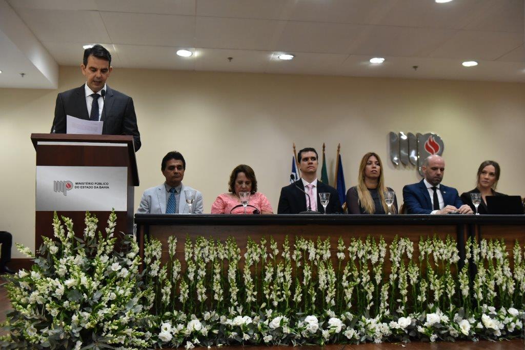 Autoridades presentes – Fizeram parte da mesa diretora da posse o procurador chefe da Procuradoria do Trabalho da 5ª Região, Luís Carlos Gomes Carneiro Filho; a subcorregedora do MP-BA, a associada da Ampeb Márcia Luzia Guedes de Lima, representando o corregedor-geral Zuval Gonçalves Ferreira; a ouvidora do MP Baiano, Cleusa Boyda de Andrade; a defensora pública e coordenadora da Defensoria Pública Especializada em Curadoria Especial, Mônica Aragão, representando o defensor público geral, Rafson Saraiva Ximenes; o presidente da Ordem dos Advogados do Brasil – seção Bahia, Fabrício de Castro Oliveira; o procurador-geral de contas junto ao Tribunal de Contas do Estado da Bahia, Antônio Tarciso Souza de Carvalho; o presidente da Associação de Juízes Federais (AJUFE-BA), Saulo Casali Bahia, representando o juiz diretor do Foro da Justiça Federal da Bahia, Dirley da Cunha Júnior; a presidente da Associação dos Magistrados da Baha, Élbia Araújo, representando o presidente da Associação dos Magistrados Brasileiros, Jayme Martins de Oliveira Neto; a presidente da Associação dos Magistrados da Justiça do Trabalho da 5ª Região, Cecília Pontes Barreto Magalhães; o conselheiro federal da Ordem dos Advogados do Brasil, Carlos Alberto Medauar, representando o presidente Ordem dos Advogados do Brasil, Felipe Santana Cruz e o presidente do Instituto dos Auditores Fiscais, Marcos Antônio da Silva Carneiro.