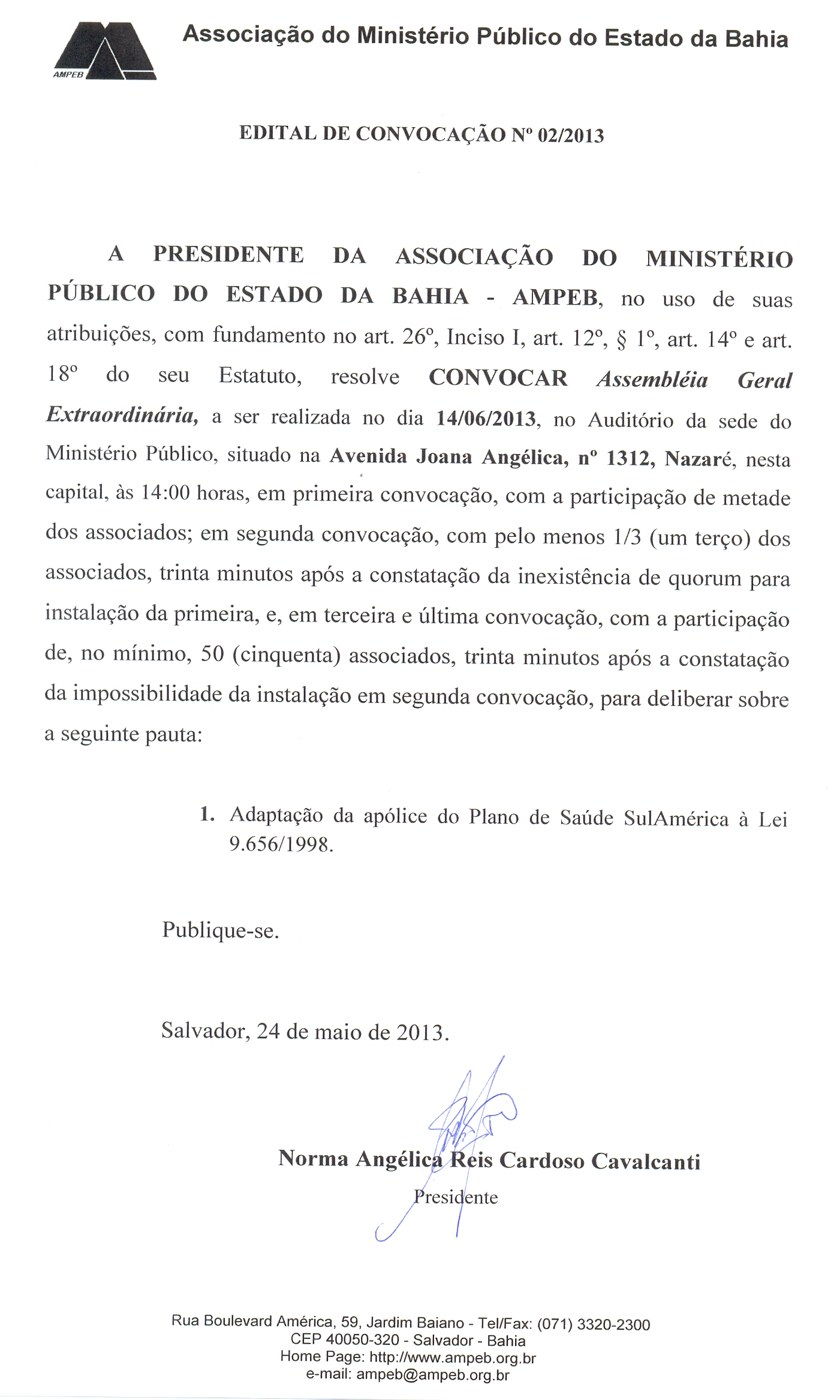 A PRESIDENTE DA ASSOCIAÇÃO DO MINISTÉRIO PÚBLICO DO ESTADO DA BAHIA – AMPEB, no uso de suas atribuições, com fundamento no art. 26º, Inciso I, art. 12º, § 1º, art. 14º e art. 18º do seu Estatuto, resolve CONVOCAR Assembléia Geral Extraordinária, a ser realizada no dia 14/06/2013, no Auditório da sede do Ministério Público, situado na Avenida Joana Angélica, nº 1312, Nazaré, nesta capital, às 14:00 horas, em primeira convocação, com a participação de metade dos associados; em segunda convocação, com pelo menos 1/3 (um terço) dos associados, trinta minutos após a constatação da inexistência de quorum para instalação da primeira, e, em terceira e última convocação, com a participação de, no mínimo, 50 (cinquenta) associados, trinta minutos após a constatação da impossibilidade da instalação em segunda convocação, para deliberar sobre a seguinte pauta: