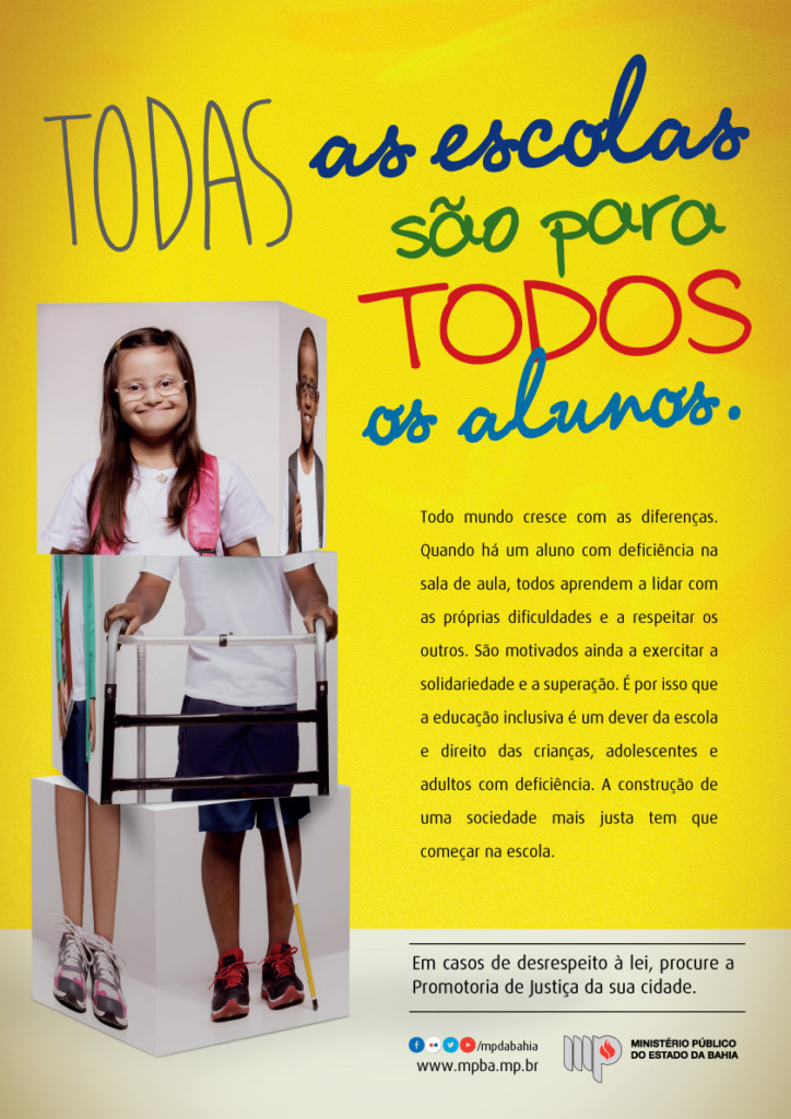 Após um levantamento de demanda, acerca de recusas de acesso à escola por parte de pessoas com deficiência ou ausência de uma oferta adequada de adaptações, material didático e profissionais de apoio, o MP baiano lançou, em 2014, uma campanha que se chama: Todas as escolas são para todos os alunos.