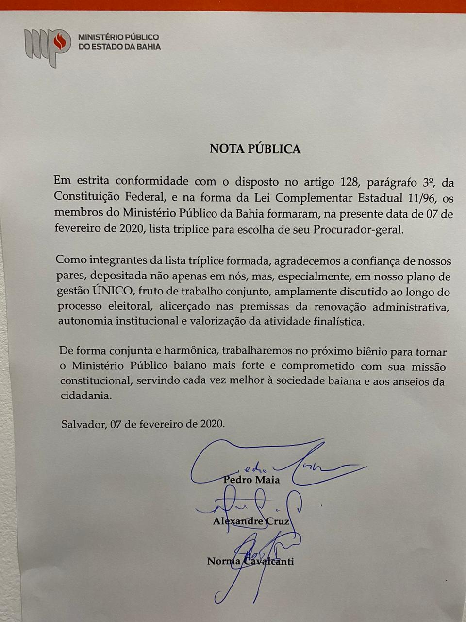 Após o resultado do pleito, os integrantes da lista tríplice assinaram nota pública ratificando compromisso de trabalhar conjuntamente, como divulgado durante a campanha eleitoral. Na nota, afirmam que trabalharão para tornar o Ministério Público mais forte e comprometido com sua missão constitucional. Veja aqui a nota na íntegra.