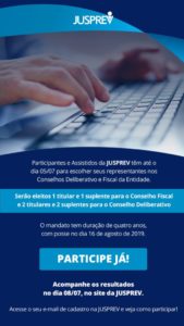 Participantes e assistidos da JUSPREV poderão escolher seus representantes nos Conselhos Deliberativo e Fiscal da Entidade até o dia 05 de julho de 2019. Serão eleitos 1 titular e 1 suplente para o Conselho Fiscal e 2 titulares e 2 suplentes para o Conselho Deliberativo, para mandato de 4 anos. A votação é eletrônica e realizada por meio de link enviado para o e-mail de cadastro de todos os participantes e assistidos da JUSPREV.