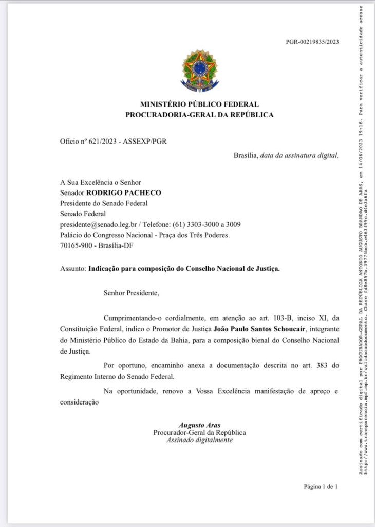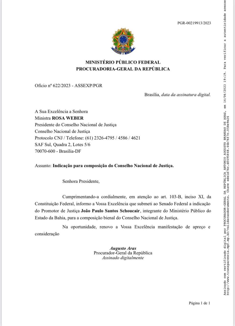 O promotor de Justiça do Ministério Público do Estado da Bahia (MP-BA) João Paulo Schoucair foi indicado pelo procurador-geral da República, Augusto Aras, para ocupar a vaga destinada aos Ministérios Públicos estaduais na composição do Conselho Nacional de Justiça (CNJ) no biênio 2024-2026. Schoucair busca a recondução, pois atua como conselheiro desde 2022, e passará por sabatina no Senado, que pode confirmar ou rejeitar a indicação.