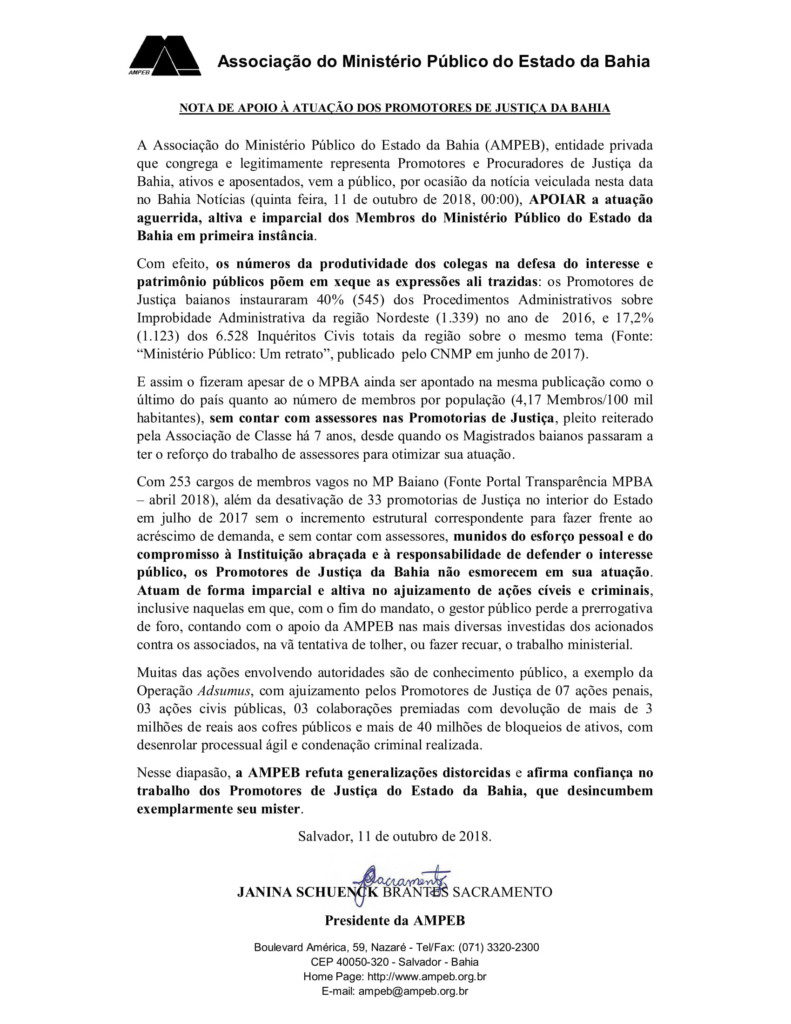 Veja a nota de apoio da Ampeb à atuação dos promotores de Justiça da Bahia. Clique na imagem abaixo: