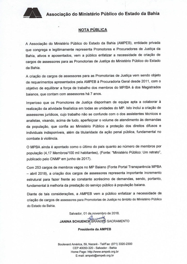 Nota Pública – Ampeb enfatiza necessidade de criação de cargos de assessores para promotorias de Justiça do MP-BA