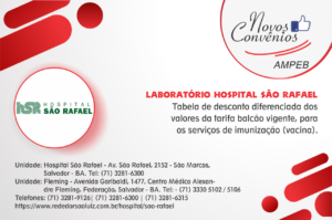 O número de novos acordos com descontos especiais para associados da AMPEB continua a crescer. Desta vez, foi o laboratório do Hospital São Rafael que conta também com o serviço de imunização. Os associados poderão ter descontos diferenciados nos serviços de imunização, vacina, em tabela balcão vigente.