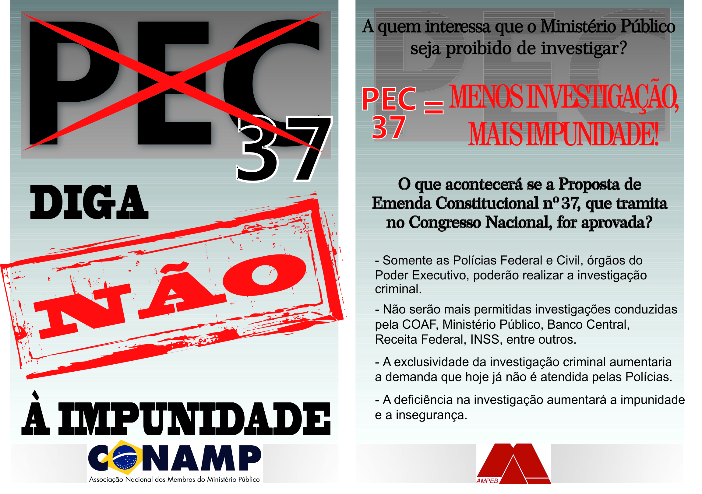 Através de nota técnica enviada em janeiro deste ano a deputados, senadores e ao Executivo, a Conamp se manifestou contra a PEC da Impunidade. De acordo com o documento, “as investigações realizadas pelo MP não são questionadas perante os tribunais superiores nem prejudicam a tramitação dos processos, já que tanto o Supremo Tribunal Federal quanto o Superior Tribunal de Justiça sedimentaram sua jurisprudência no sentido de que o MP está constitucionalmente autorizado, como titular da ação penal, a instaurar procedimentos investigatórios de natureza criminal. É importante frisar que em nada se confundem com o inquérito policial, este sim instaurado exclusivamente pela Polícia Judiciária”.