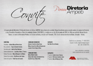 A sessão solene de posse da nova Diretoria da Ampeb e dos Conselhos Fiscal e Consultivo da Ampeb, biênio 2019/2021, será realizada no dia 14 de junho de 2019, às 16h, no auditório Afonso Garcia Tinoco, na sede do Ministério Público do Estado da Bahia, situada na 5ª Avenida, 750, Centro Administrativo da Bahia, Salvador – Bahia.