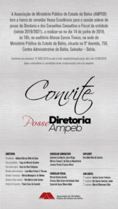 A sessão solene de posse da nova Diretoria da Ampeb e dos Conselhos Fiscal e Consultivo da Ampeb, biênio 2019/2021, será realizada no dia 14 de junho de 2019, próxima sexta-feira, às 16h, no auditório Afonso Garcia Tinoco, na sede do Ministério Público do Estado da Bahia, situada na 5ª Avenida, 750, Centro Administrativo da Bahia, Salvador – Bahia. Será empossada a chapa liderada pelo promotor de Justiça, Adriano Marcus Brito de Assis.