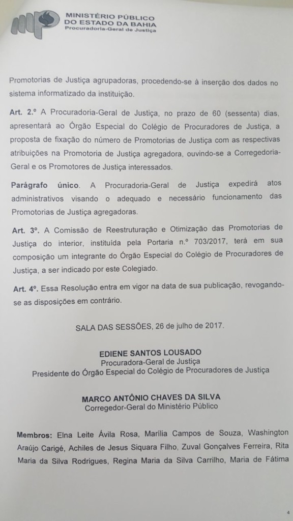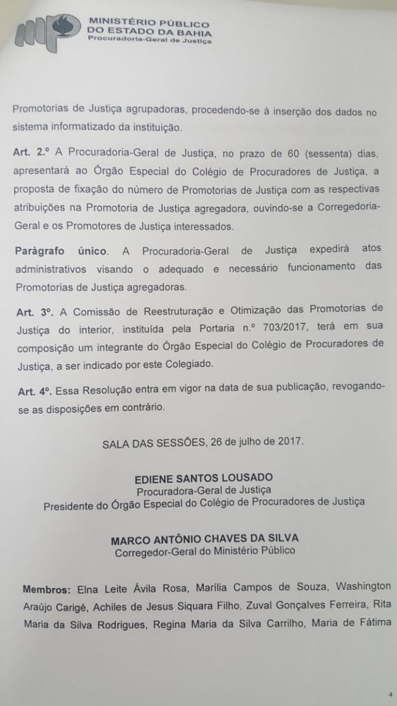 Na tarde desta quarta-feira (26/07), foi aprovada pelo Órgão Especial do Colégio de Procuradores do Ministério Público do Estado da Bahia a resolução da Procuradoria de Justiça referente à desativação de 33 comarcas no interior do Estado. A proposta foi aprovada com modificações ao texto inicial, após a manifestação da Corregedoria-Geral, que trouxe dados importantes a respeito da atuação dos membros nos municípios distantes da capital.