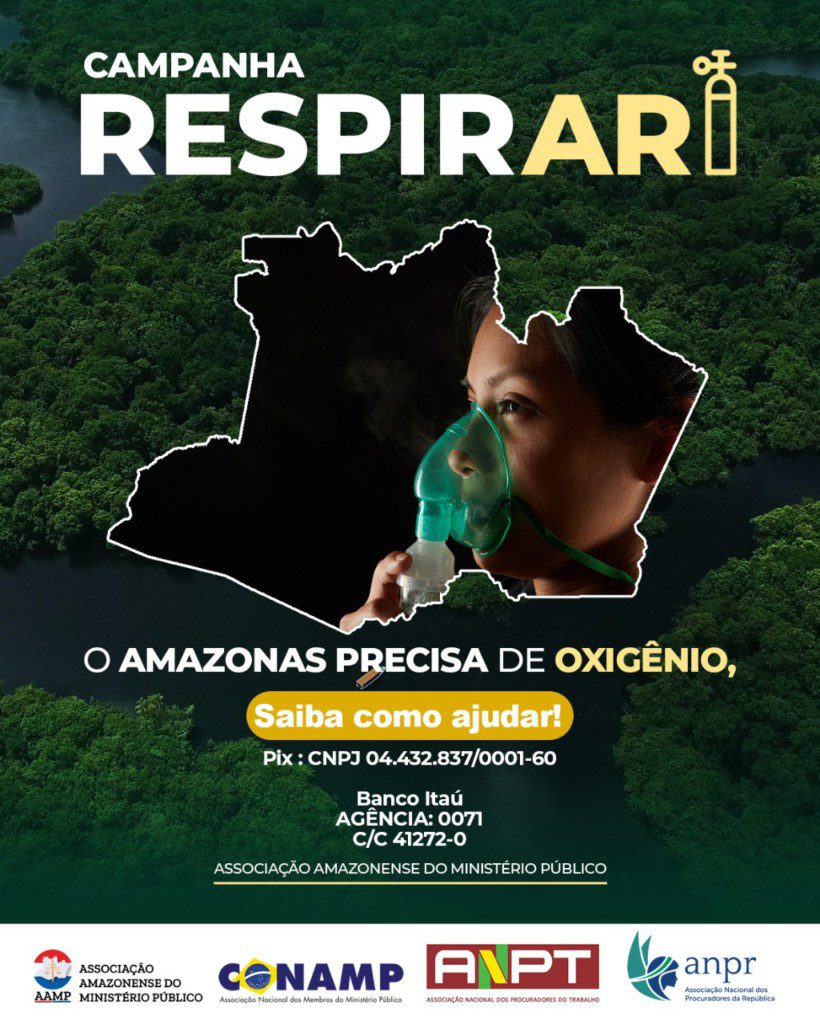 Diante do momento vivenciado no estado do Amazonas, a Associação Amazonense do Ministério Público, em conjunto com a CONAMP, a ANPR e ANPT lançaram a Campanha de doação RESPIRAR, que visa ajudar o estado na aquisição de cilindros de oxigênio, além de contribuir para a construção de uma miniusina de oxigênio que certamente ajudará a salvar incontáveis vidas.