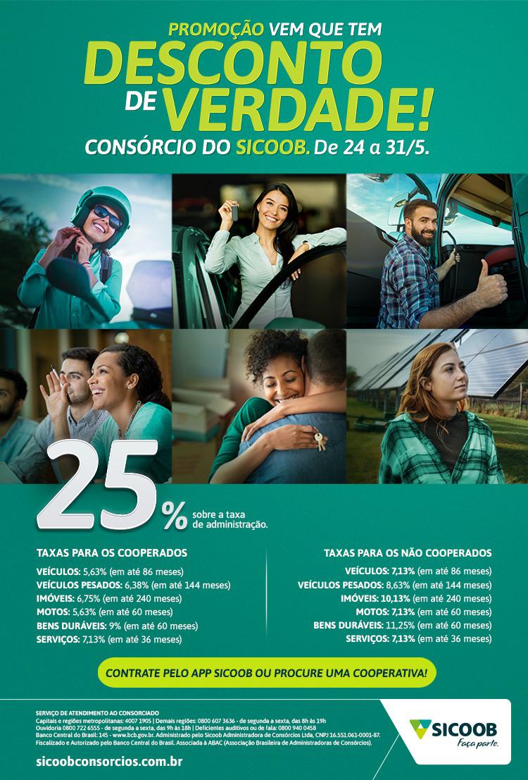 Nessa semana o Sicoob está com condições imperdíveis para o consórcio. A taxa de administração está com 25% de desconto. Não perca essa oportunidade de adquirir seu consórcio com a menor taxa de administração do mercado. A promoção vai até o dia 31/05!