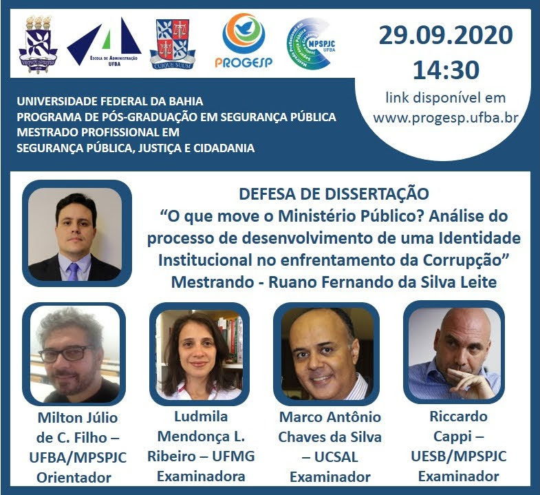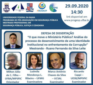 O associado Ruano Leite teve sua dissertação de mestrado aprovada na última semana no Mestrado Profissional em Segurança Pública, Justiça e Cidadania, da Universidade Federal da Bahia. Com o título “O que move o Ministério Público? Análise do processo de desenvolvimento de uma identidade institucional no enfrentamento da corrupção”, o trabalho foi aprovado com nota máxima pela banca examinadora.