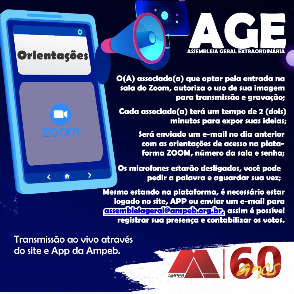 Nesta sexta-feira, dia 12 de fevereiro, a partir das 8h30, será realizada pela Ampeb uma Assembleia Geral Extraordinária (AGE), exclusivamente por intermédio da rede mundial de computadores, para apresentação de proposta de alteração do Estatuto da Associação.