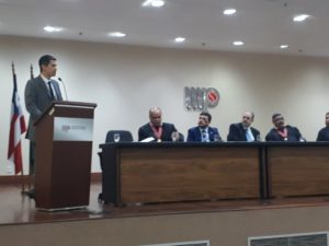 O presidente em exercício da Ampeb, Millen Castro, que também estava representando o presidente da CONAMP, Victor Hugo Azevedo, a diretora secretária-geral, Patrícia Kathy Medrado, e a diretora administrativa da entidade, Rita Márcia, estiveram presentes no evento. O presidente iniciou seu discurso citando os versículos bíblicos: “Não julgueis, para que não sejais julgados” e “Tira primeiro a trave do teu olho, e então poderás ver com clareza para tirar o cisco do olho de teu irmão” (Mateus) para destacar o quão difícil, árdua e perigosa é a atividade de julgar, principalmente quando se fala daquele que atua como fiscal dos fiscais, mas também que o julgamento deve levar sempre em consideração a situação do outro.